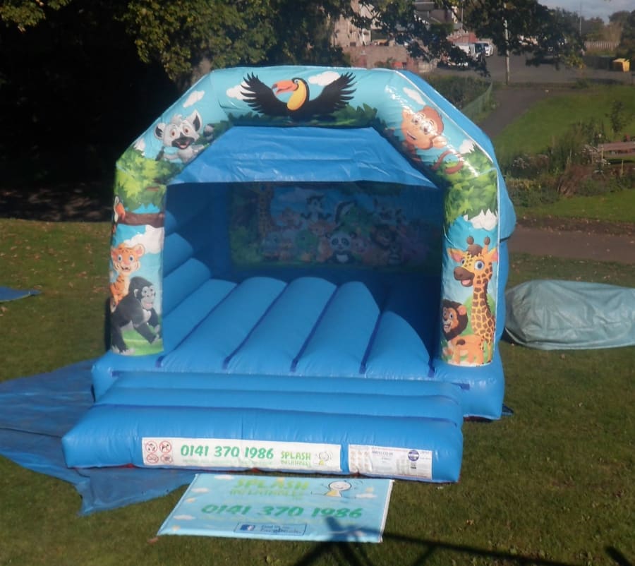 This is a beautiful Jungle themed bouncy castle with roof available for hire